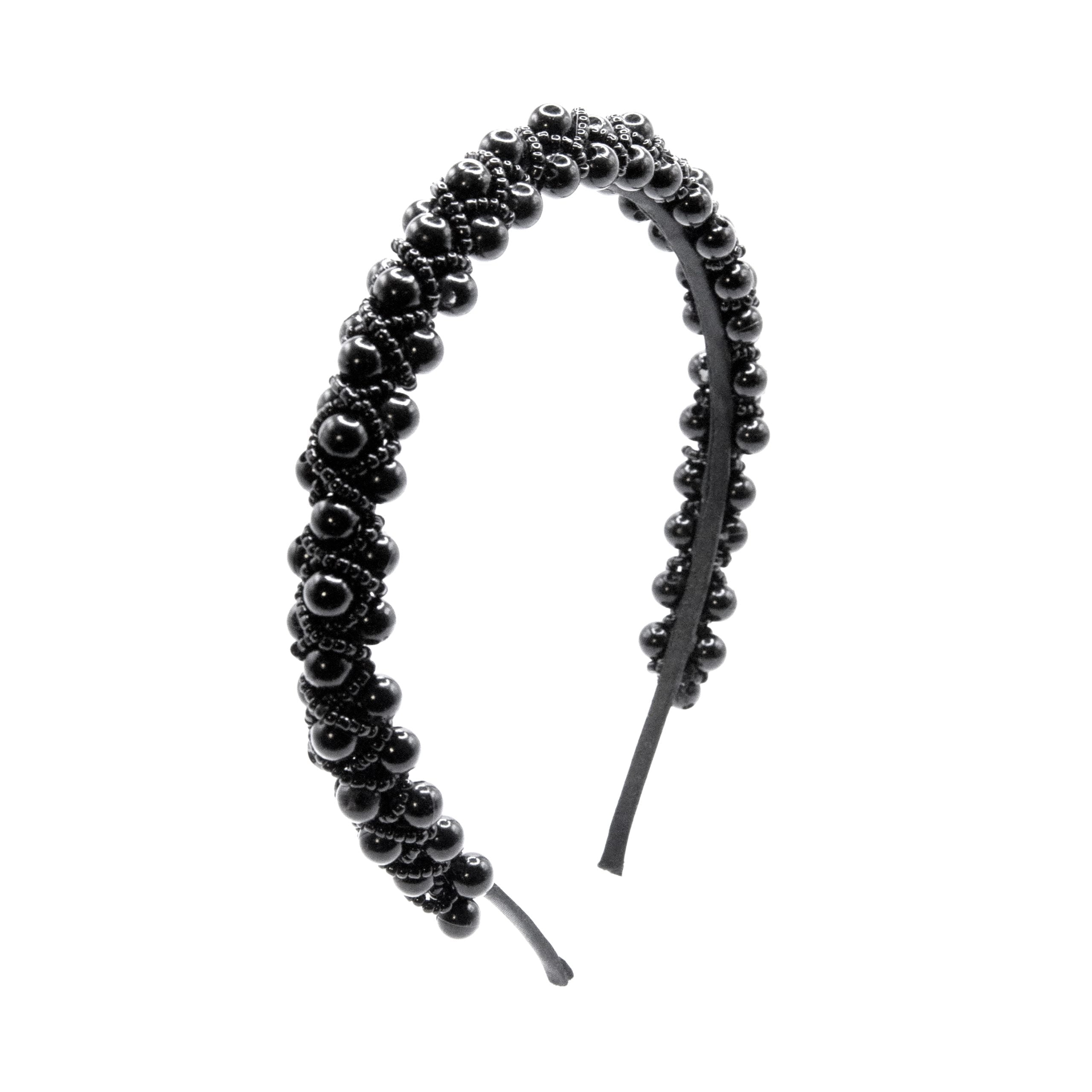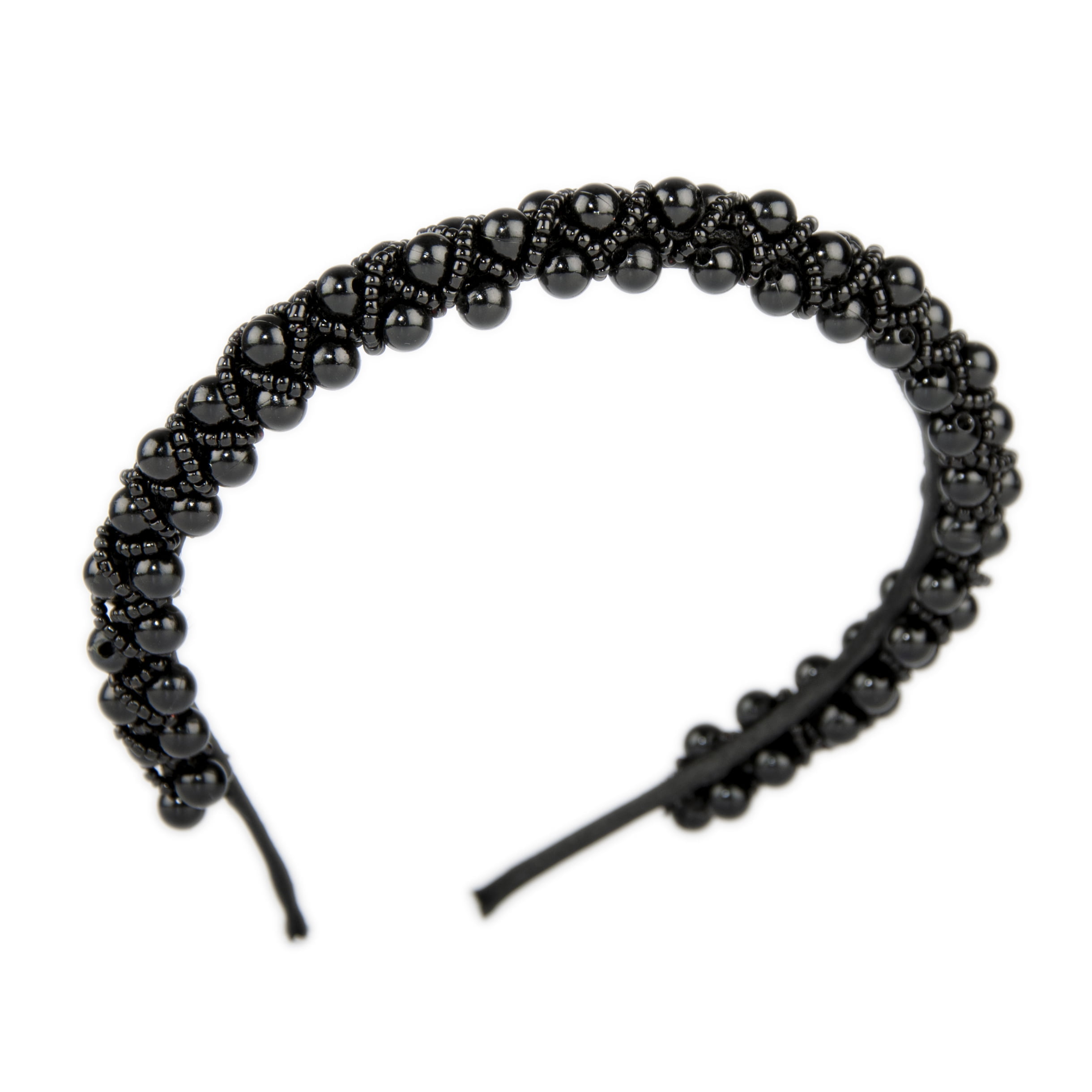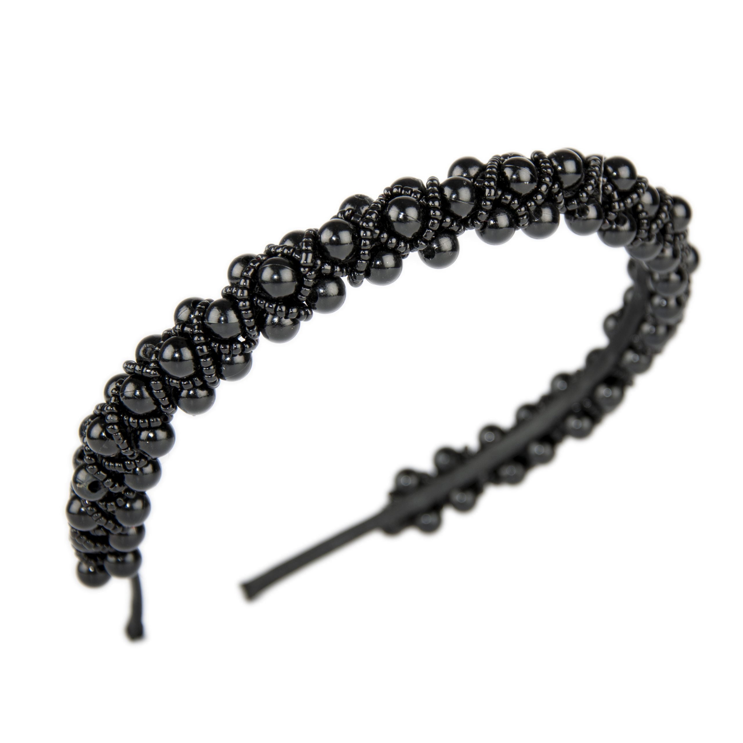 Narrow metal headband, covered in black satin, embroided with braided strings of black beads of different dimensions.