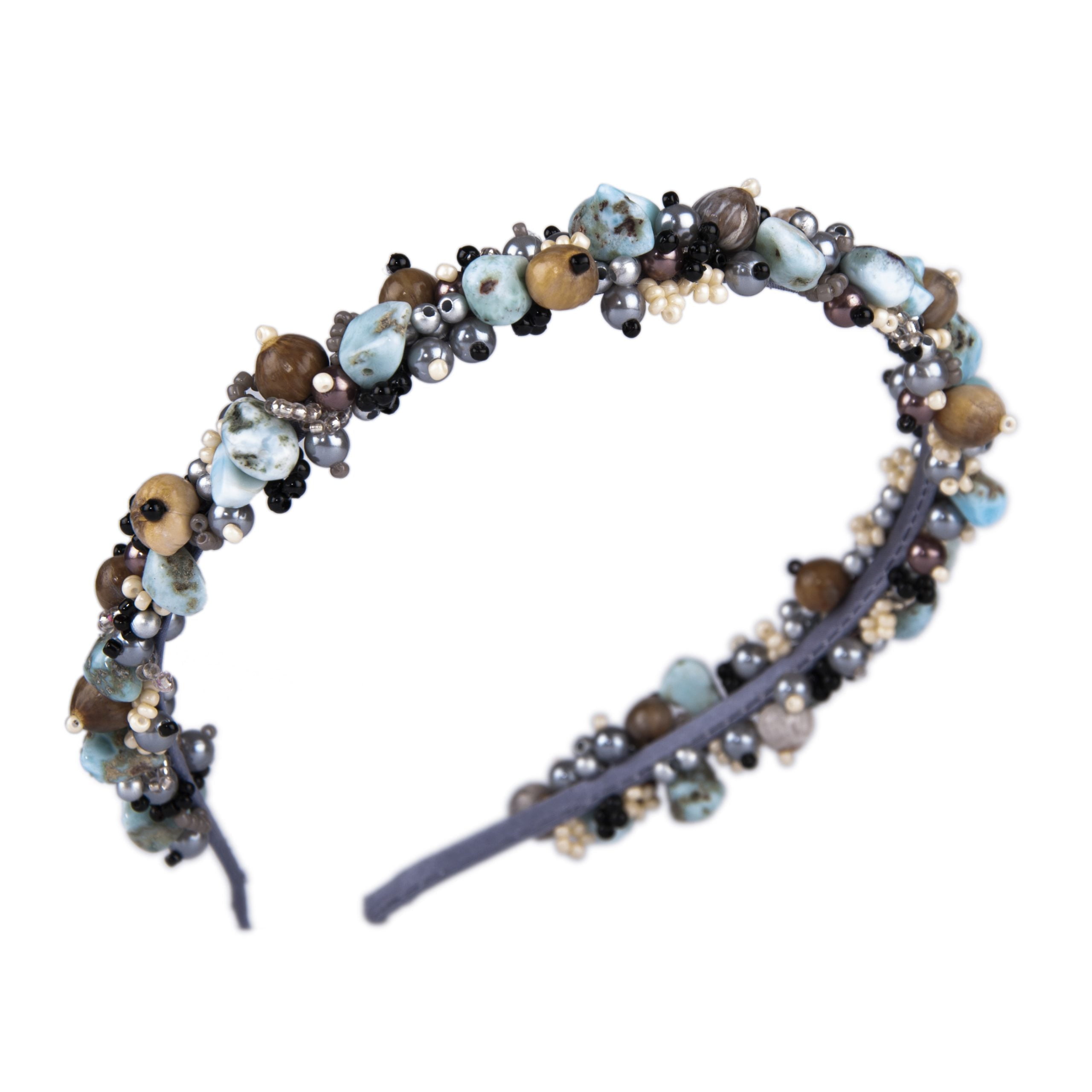 Narrow headband, 1 cm wide, covered in matte gray satin, embroidered with light blue Larimar semi-precious stones, gray and dusty pink faux pearls, transparent glass, beige organic seed pods, and small black acrylic beads. This color scheme is truly refined, perfect for any season and occasion.